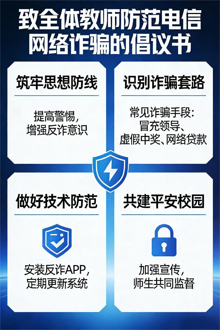 老师们,防骗反诈无小事,平安校园靠大家。防范电信网络诈骗,不仅关乎我们个人及家庭的财产安全,更是我们作为教育工作者维护校园和谐稳定、履行社会责任的具体体现。让我们从自身做起,从细节做起,提高警惕、增强本领、主动防范,自觉抵制各类电信网络诈骗,共同织密校园反诈防护网,为创建“无诈校园”、守护校园平安贡献每一份力量!